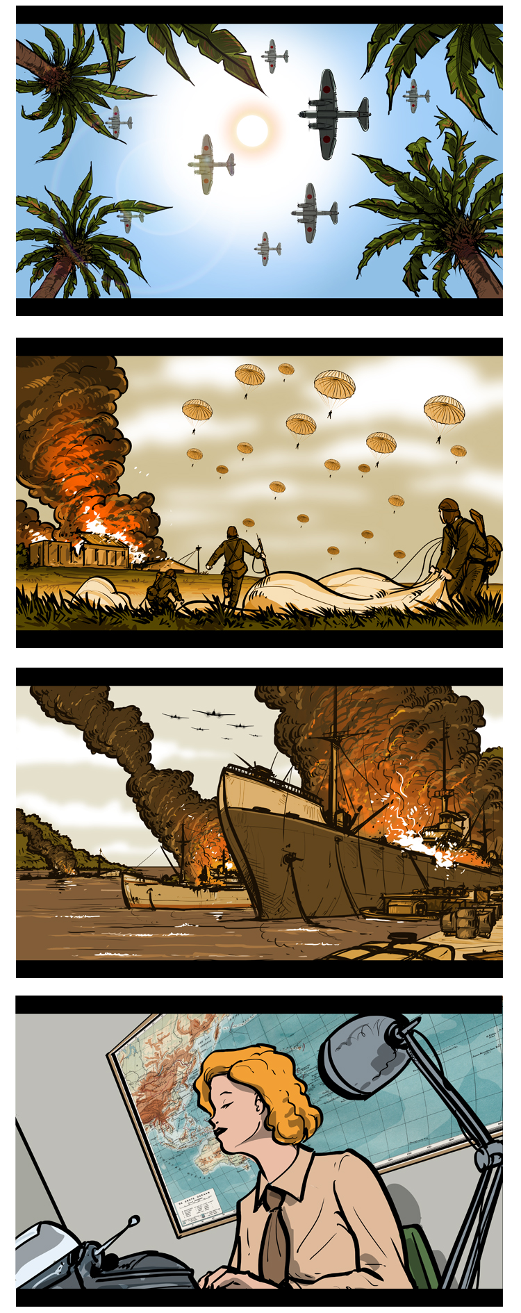 These are a selection of several layered illustrations that were used for a documentary about POW in the pacific during WWII.